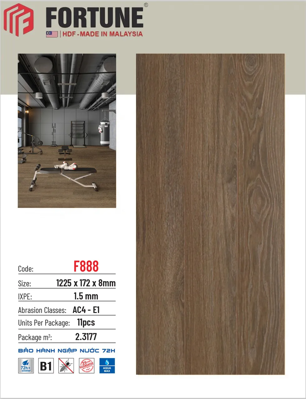 Sàn gỗ công nghiệp Fortune 8mm F8 made in Malaysia chịu nước 72h Nội Thất NDA
