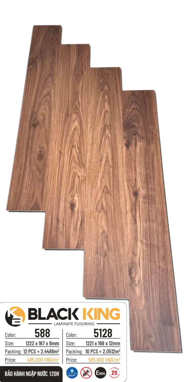 Sàn gỗ công nghiệp Black King là dòng sàn laminate cao cấp với hai phiên bản màu 585 và 5125, nổi bật nhờ khả năng chịu nước vượt trội bảo hành ngập nước 120H, tiêu chuẩn phát thải E-min an toàn sức khỏe và chế độ bảo hành lên đến 25 năm. Với thiết kế vân gỗ tự nhiên sang trọng, Black King là lựa chọn lý tưởng cho căn hộ, biệt thự, văn phòng và các công trình thương mại cao cấp tại Việt Nam.