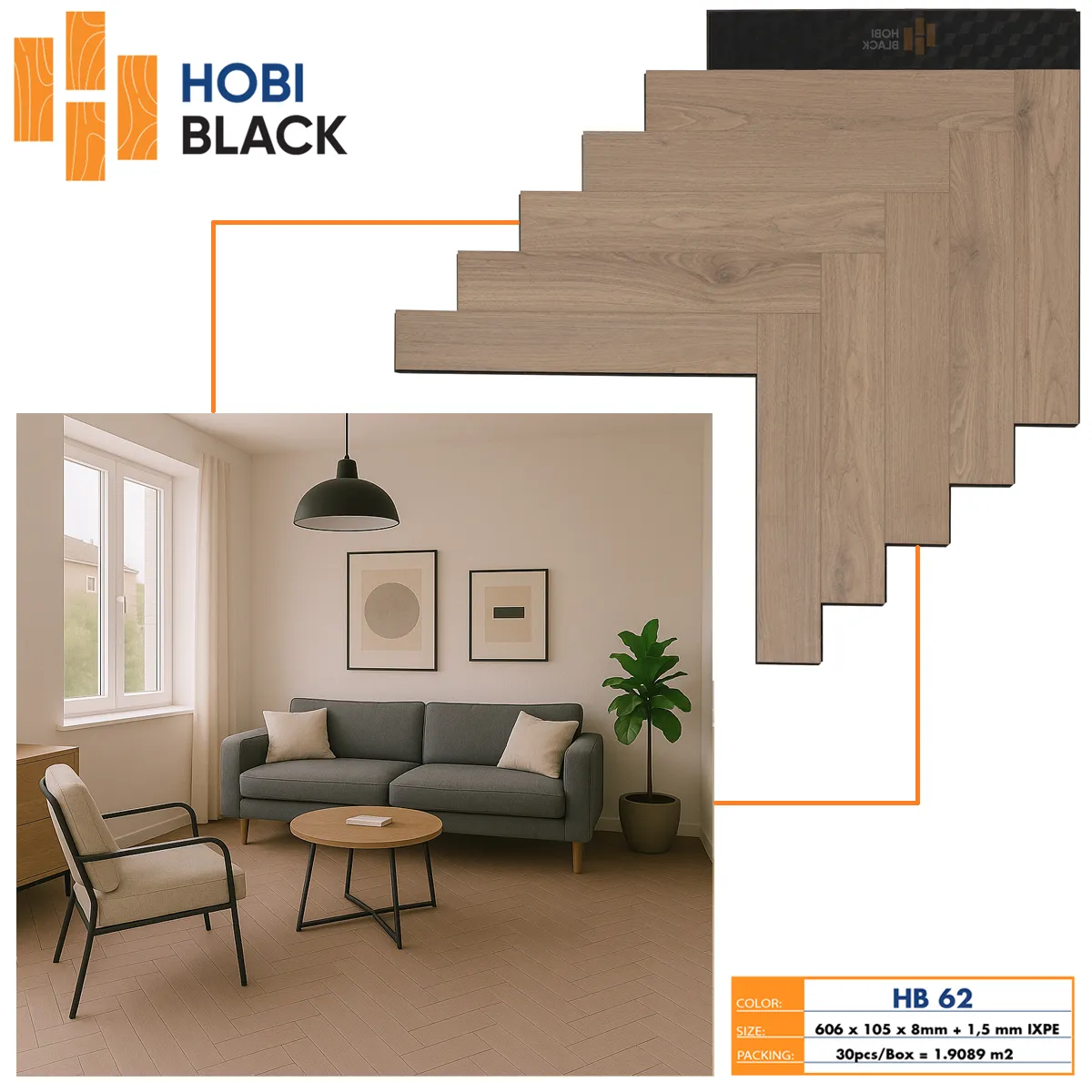 Nhằm nâng tầm chất lượng sống cho gia chủ, mỗi thanh ván sàn xương cá HB 68 đều được nhà máy dán sẵn một lớp lót đệm IXPE dày 1.5mm ở mặt đáy. Lớp màng cao cấp này đóng vai trò như một bộ phận giảm xóc, giúp triệt tiêu tối đa tiếng ồn truyền tầng và âm thanh lộp cộp khi di chuyển. Đồng thời, nó tạo ra độ đàn hồi nhẹ, mang lại cảm giác vô cùng êm ái, chắc chân cho người sử dụng, đặc biệt an toàn cho gia đình có trẻ nhỏ và người lớn tuổi.